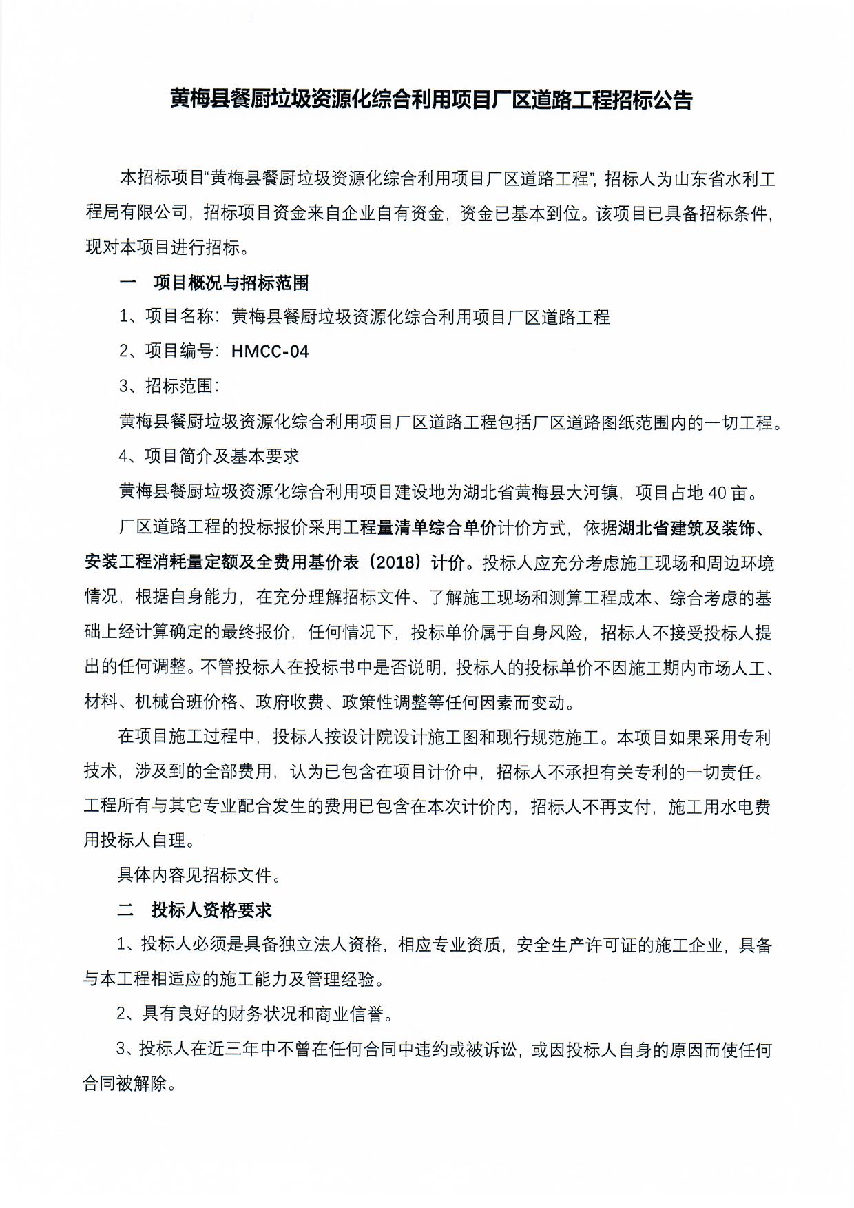 黃梅縣餐廚垃圾資源化綜合利用項目廠區(qū)道路工程招標(biāo)公告