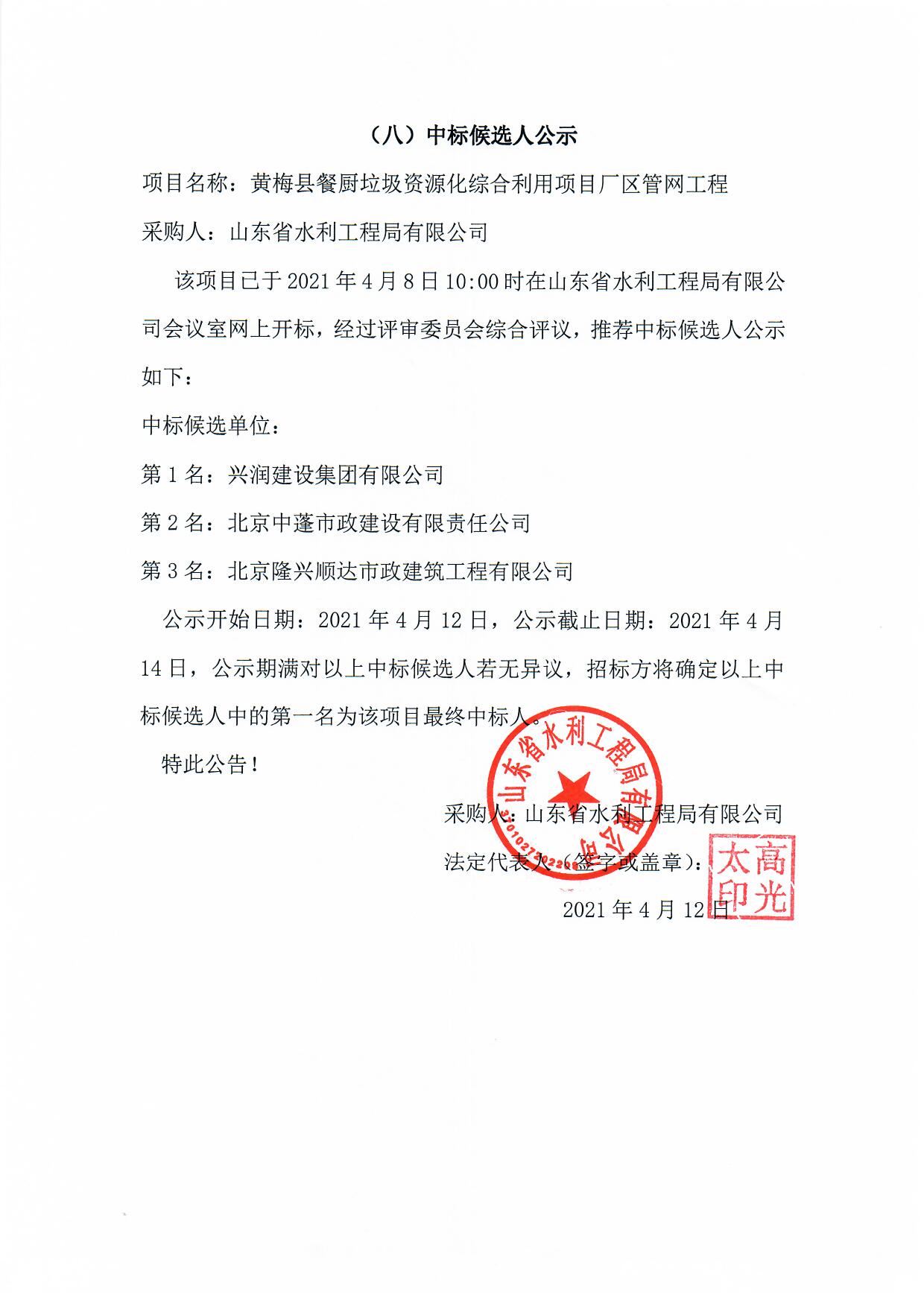 山東省水利工程局有限公司餐廚垃圾處理廠智能信息化管控平臺中標(biāo)候選人公示