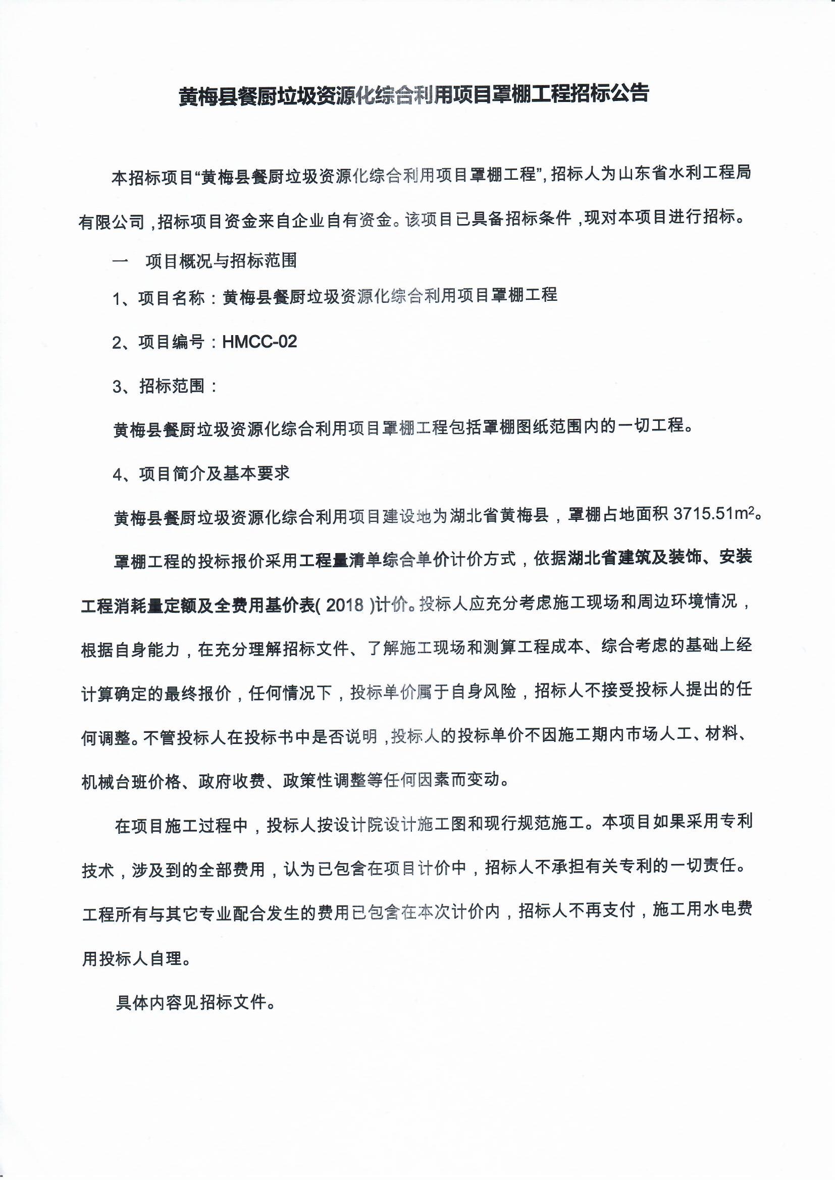 黃梅縣餐廚垃圾資源化綜合利用項目罩棚工程招標公告