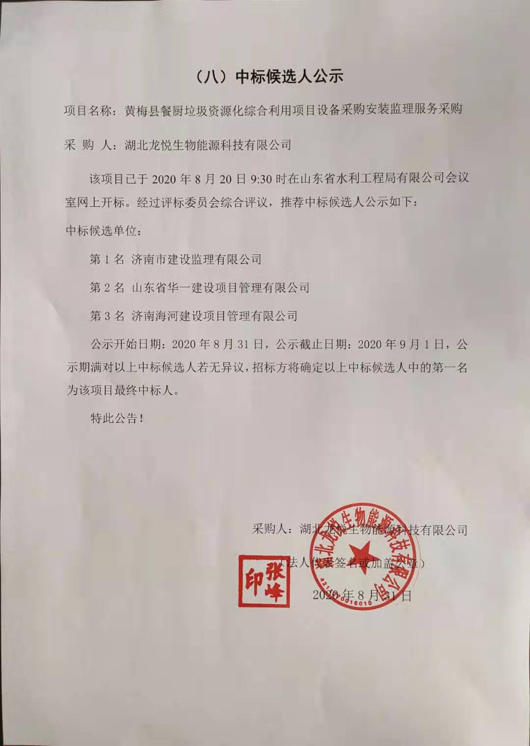黃梅縣餐廚垃圾資源化綜合利用項目設(shè)備采購安裝監(jiān)理服務(wù)采購中標(biāo)候選人公示