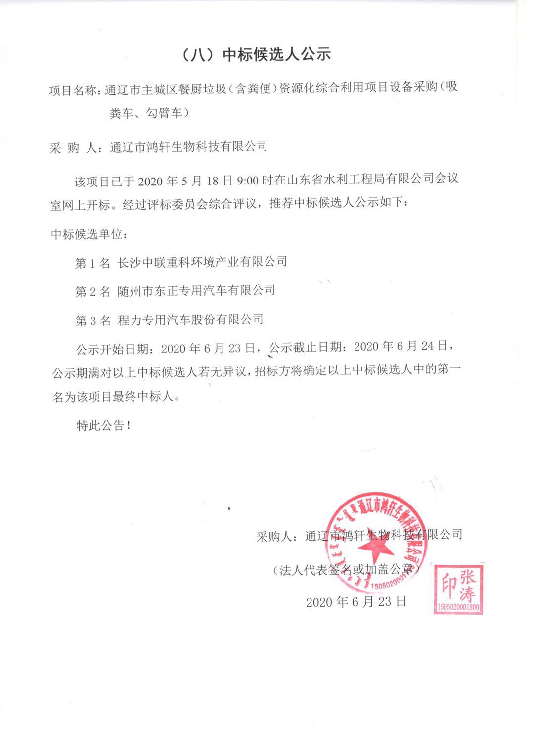 通遼主城區(qū)餐廚垃圾(含糞便)資源化綜合利用項(xiàng)目設(shè)備采購中標(biāo)候選人公示
